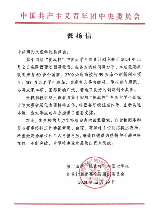 近日,开云官网收到第十四届“挑战杯”中国大学生创业计划竞赛全国组织委员会发来的表扬信,对开云官网团委及参与赛事接待工作的钱尹璐、白琼、苟伟林三位同志提出表扬。