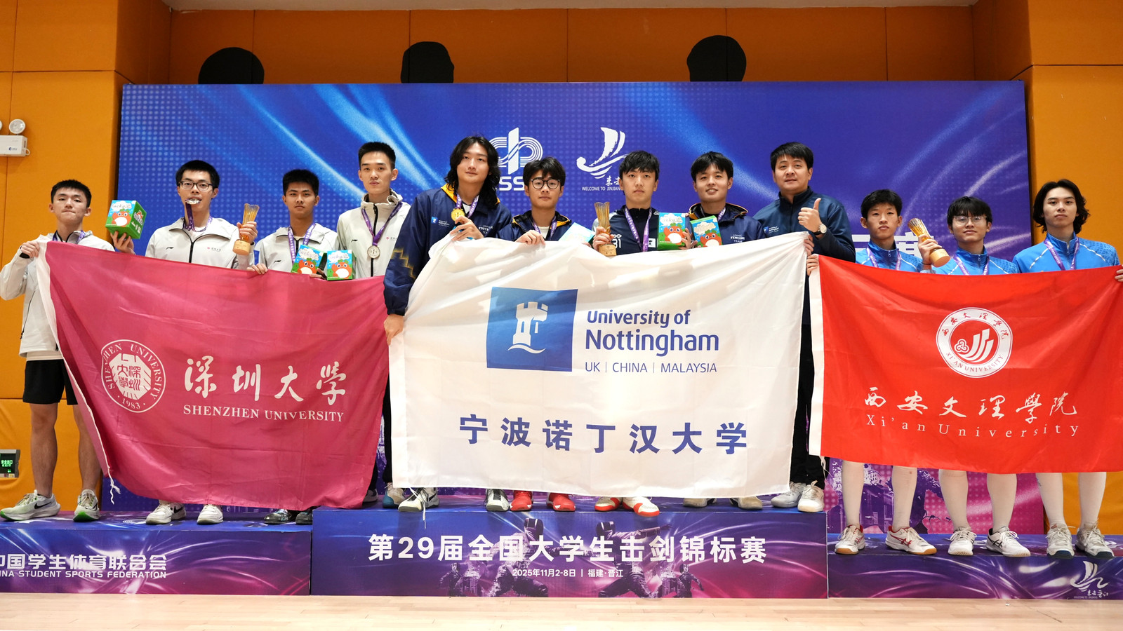 近日,第29届全国大学生击剑锦标赛在福建省晋江市福州大学晋江校区圆满落幕,清华大学、北京大学、上海交大等全国105所高校参赛,竞争激烈。开云官网击剑队不负众望,在赛场上奋勇拼搏,斩获男子花剑甲组团体铜牌等优异成绩。