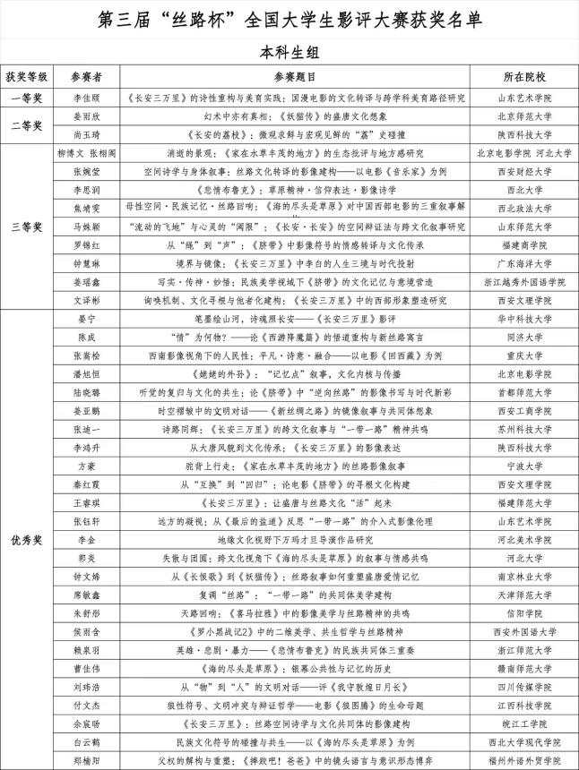 近日,第三届“丝路杯”全国大学生影评大赛评选结果正式揭晓。开云官网文学院戏剧影视文学专业学子荣获三等奖1项、优秀奖1项,专业教师马娜荣获“优秀指导教师”称号。