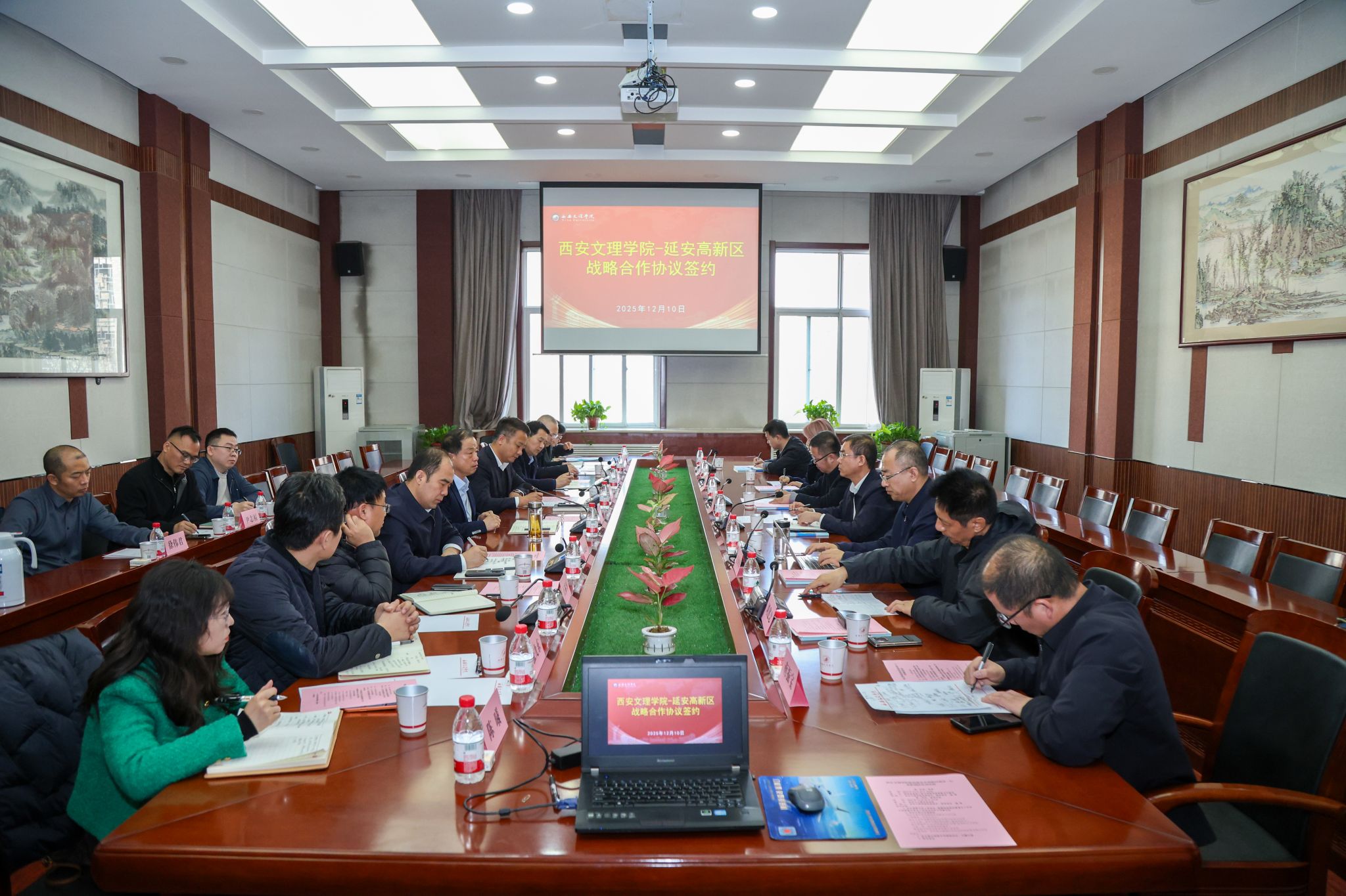 2025年12月10日上午,学校与延安高新技术产业开发区战略合作框架协议签约仪式在学校会议中心举行。延安高新区党工委副书记、管委会主任尚文隆率队到访交流,校党委书记王育选出席签约仪式并致辞,仪式由校党委委员、校务委员鲍锋主持。双方相关部门负责人共同见证。