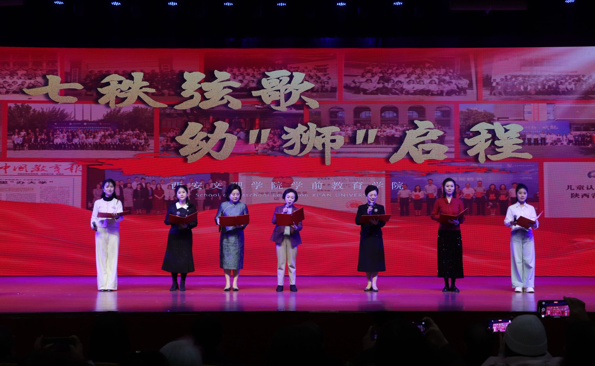 原西安幼儿师范学校校长张国华、原幼儿师范学院院长刘迎接、学前教育学院首任院长蔡军、40多位校友代表、50余家用人单位及兄弟高校参加活动,张国华回顾了专业办学七十年传承积淀,对专业建设取得的跨越式发展表示肯定,并对未来继续深耕学前教育专业领域寄予厚望。西北工业大学幼儿园院长王莉等来自不同阶段的校友与在校学生共同带来主题合诵,展现薪火相传的精神力量。