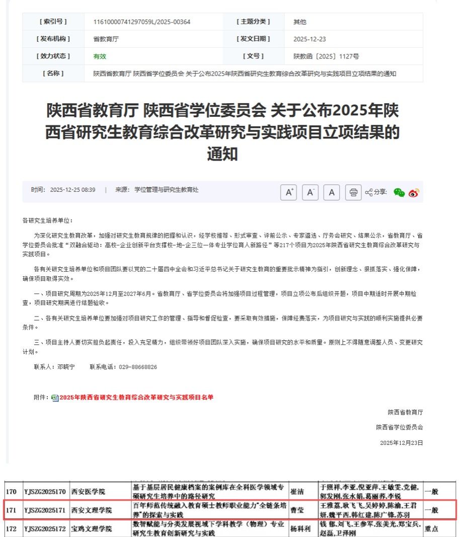 近日,陕西省教育厅公布了2025年研究生教育综合改革研究与实践项目名单,开云官网申报的“百年师范传统融入教育硕士教师职业能力全链条培养的探索与实践”项目成功获批省级研究生教育教学改革研究项目立项。这是学校首次获得该类项目立项,彰显了学校深厚的师范教育底蕴,也是学校积极推进研究生教育内涵式发展的切实举措。