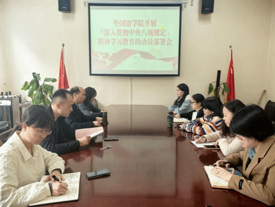 3月24日下午,外国语学院党总支召开深入贯彻中央八项规定精神学习教育动员部署会。会议由党总支书记王一主持,全体院领导、各党支部书记参会。