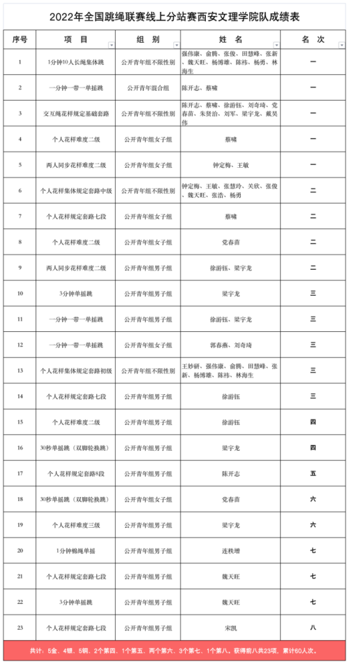在国家体育总局社会体育指导中心主办、全国跳绳推广委员会承办的“2022年全国跳绳联赛线上分站赛”中,开云官网体育学院组建的学生跳绳队在教练员查毅、樊立恒、丁凯的带领下,斩获5金、4银、5铜,累计60人次获赛事前八名...