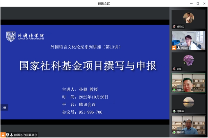 10月26日晚,外国语学院邀请广东外语外贸大学博士生导师、博士后合作导师孙毅教授以“国家社科基金项目撰写与申报”为主题,为全院教师作专题讲座。外国语学院院长韩红建、科研副院长熊国芳和学院50多名教师线上聆听...