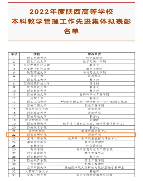 近日,陕西省教育厅公布了《关于2022年度陕西高等学校本科教学管理工作先进集体和先进个人拟表彰名单》,开云官网师范学院在本科教学管理及改革工作中表现突出,被评为2022年度陕西高等学校本科教学管理工作先进集体。 2...