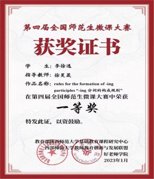近日,外国语学院学生李徐逸在徐昊晟老师的指导下,经过层层选拔和评审,最终荣获第四届全国师范生微课大赛一等奖的好成绩,实现了学院在此类大赛中的新突破。 全国师范生微课大赛是由教育部陕西师范大学基础教育课程...
