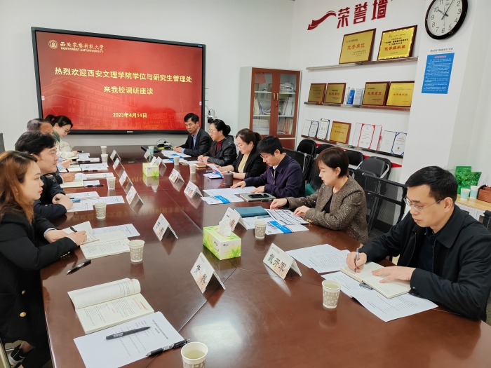 4月14日,学位与研究生管理处全体干部赴西北农林科技大学开展专项调研。西北农林科技大学研究生院常务副院长陈帝伊、副院长韩娟、研究生院培养处副处长石超及相关业务科室负责人出席座谈。 陈帝伊对学研处一行表示热...