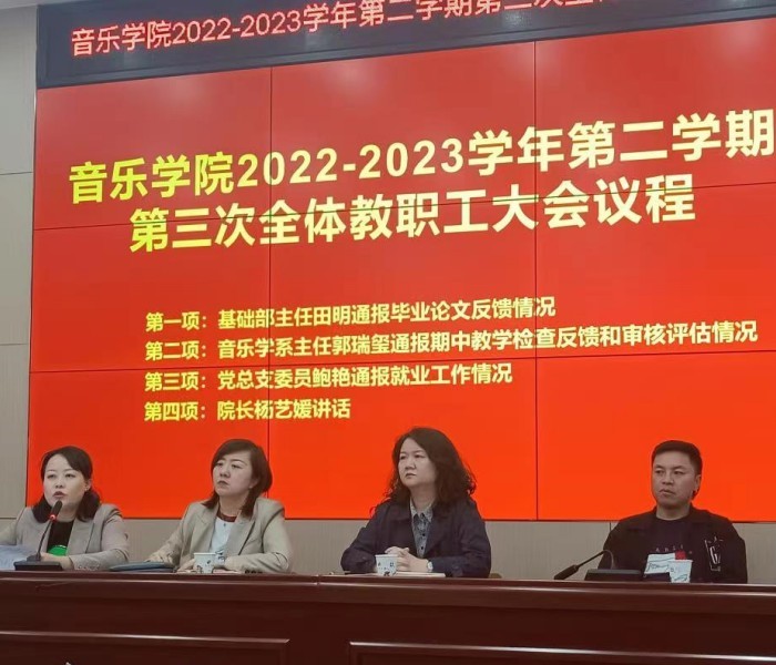5月5日下午,音乐学院召开中期检查反馈暨教育教学评估推进大会,学院党总支委员鲍艳主持会议。 学院基础部主任田明通报了学院毕业生论文反馈的相关情况,从2023届学院毕业论文预答辩、论文提交系统资料上传情况、202...