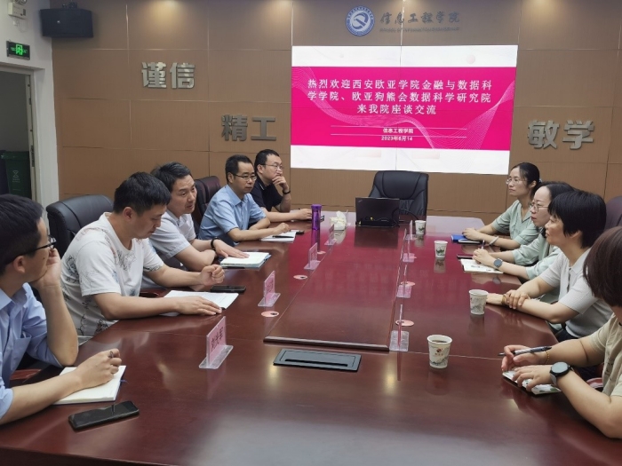 6月14日上午,西安欧亚学院金融与数据科学学院副院长申亚琛,数据科学与大数据技术专业负责人姚香秀,狗熊会数据科学研究院项目研发总监常莹、王璇等一行四人来信息工程学院座谈交流,学院副院长陈广锋、大数据教研室...