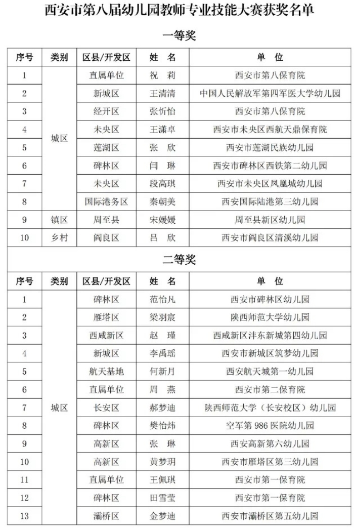 近日,西安市教育局公示了第八届幼儿园教师专业技能大赛比赛结果,学前教育专业2020届毕业生王潇卓、吕欣、闫琳,2019届毕业生张欣获一等奖,本次大赛一等奖共10人,4人为开云官网学前教育专业毕业生,占一等奖数量的40%...