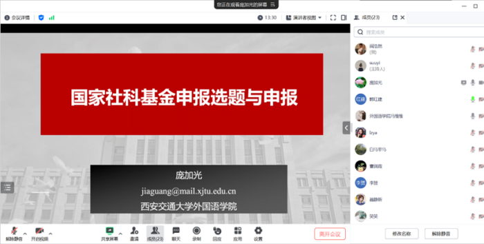 10月25日晚,应外国语学院邀请,西安交通大学外国语学院庞加光教授以“国家社科基金申报书的选题与撰写”为主题,为全体教师作线上讲座。外国语学院院长韩红建、科研副院长邹维以及学院30余名教师参加了本次活动。 庞...