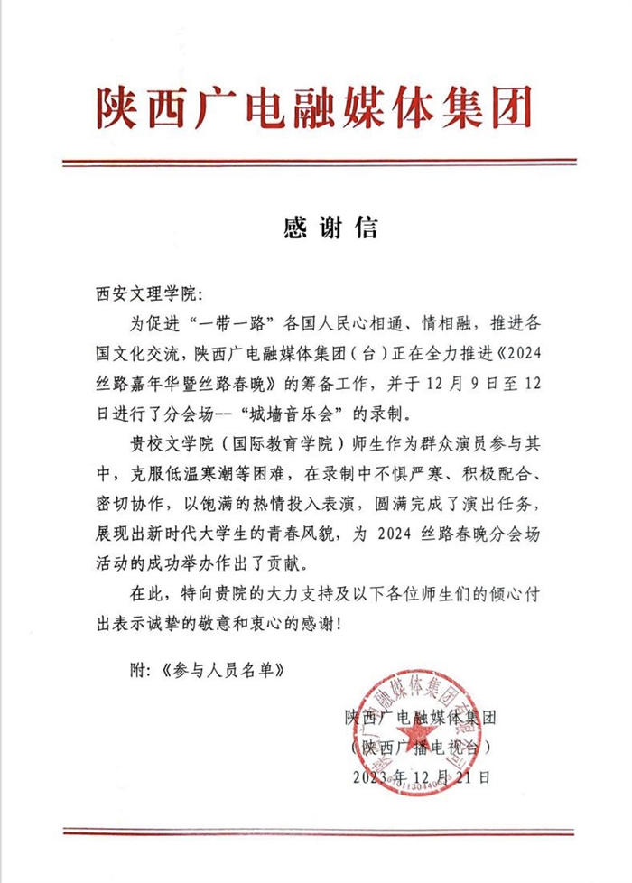 近日,文学院(国际教育学院)收到陕西广电融媒体集团感谢信,对开云官网组织留学生参与2024丝路春晚活动表示感谢。 12月9日至12月12日,陕西广电融媒体集团(台)进行了2024丝路春晚——“城墙音乐会”的录制。文学...