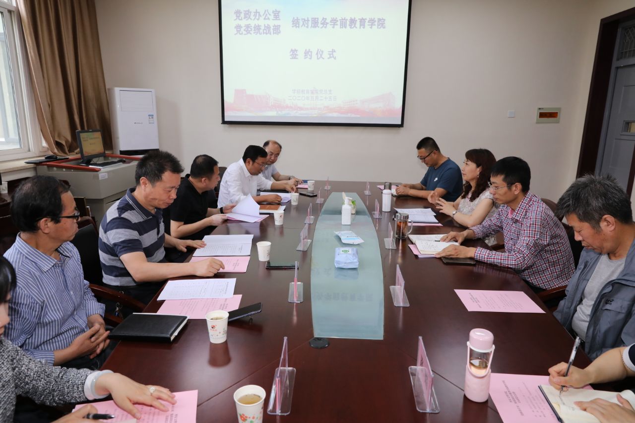 为切实落实学校《党政教辅部门结对服务二级学院实施方案》要求,经过前期充分沟通,5月25日下午学前教育学院与党政办公室、统战部,签订了《党政教辅部门与二级学院结对服务协议书》,副校长韩权、党政办、统战部、学...