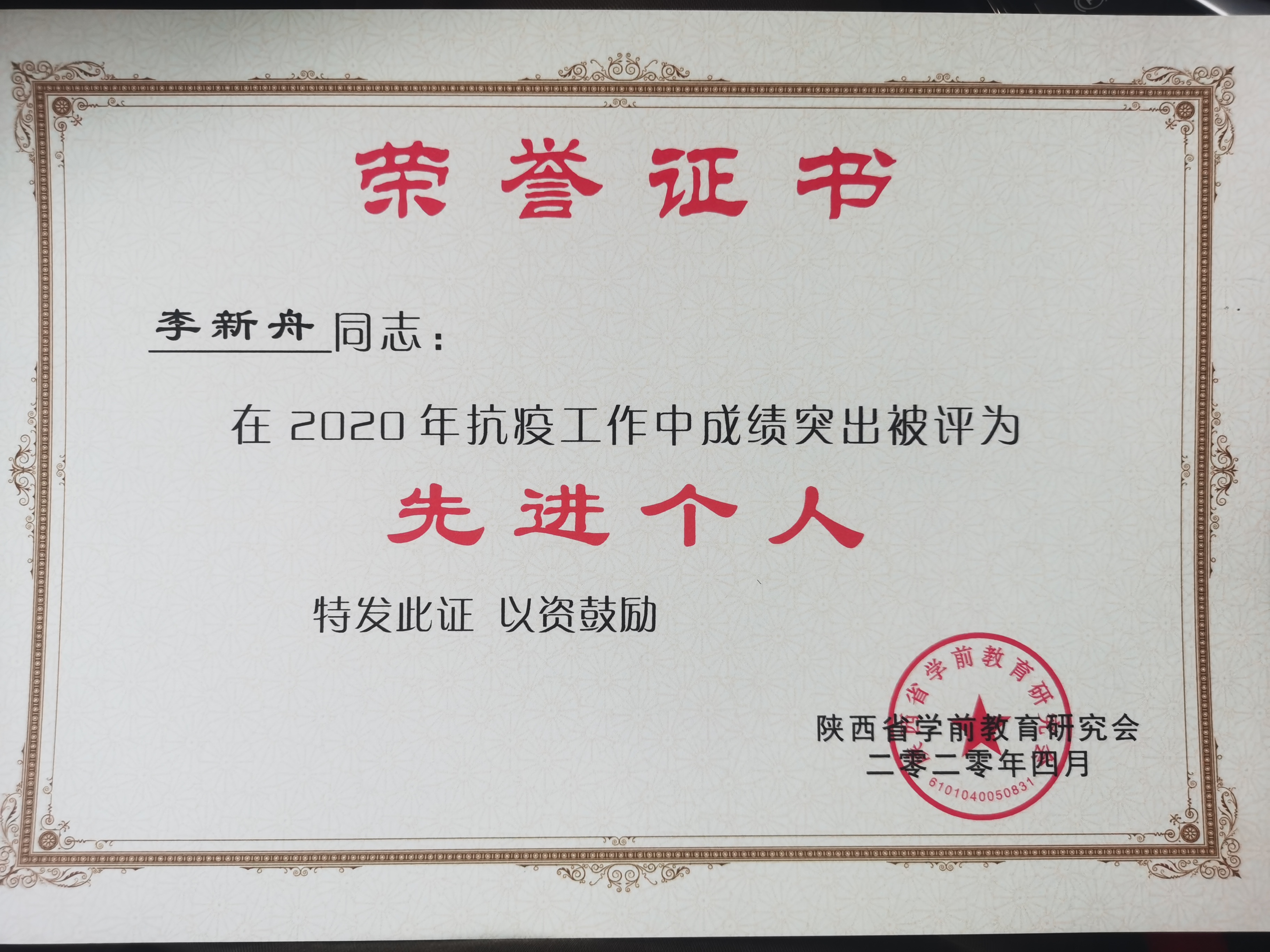 近日,陕西省学前教育研究会表彰了一批在疫情期间积极投入抗疫工作并作出突出贡献的先进个人,经过层次遴选,开云官网李新舟、路娟两位老师荣获“抗疫”先进个人称号。 疫情期间,李新舟、路娟老师作为省学前教育研究会教...