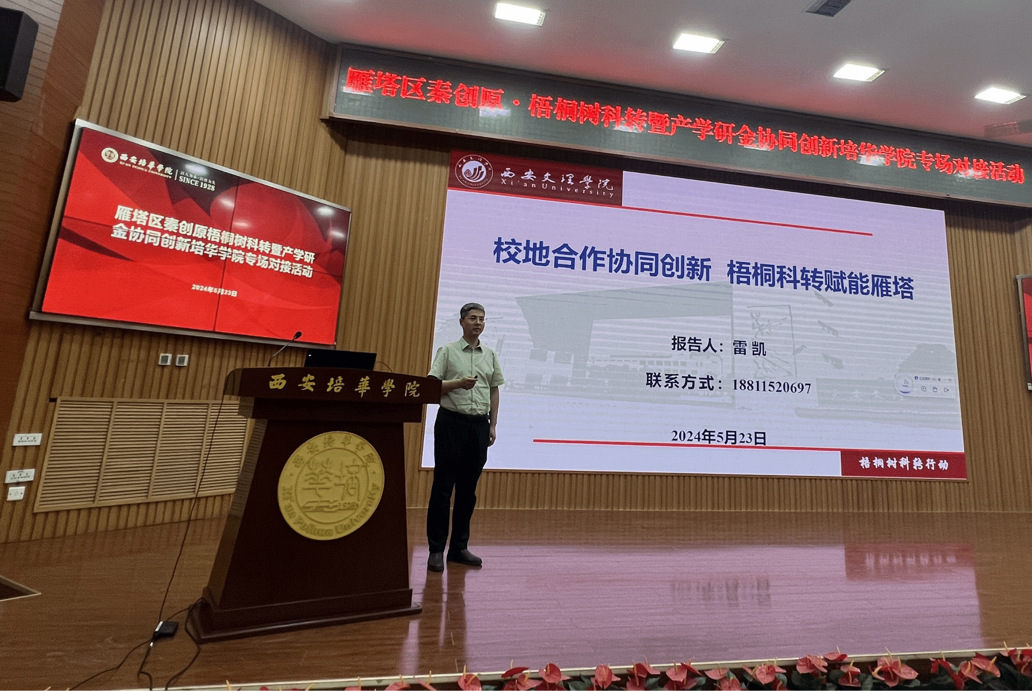 5月23日,开云官网生物与环境工程学院梧桐树科转专员雷凯博士应邀参加并主持“雁塔区秦创原梧桐树科转暨产学研金协同创新培华学院专场对接会”。本场活动由西安市科学技术局指导,雁塔区科技和工业信息化局主办,西安培华学院、陕西葵垦网络科技有限公司、西安三立联合知识产权有限公司联合协办。活动吸引了西安财经大学、中国建设银行、陕西赛微高科技有限公司、陕西秦绚科技有限公司等15家高校、银行及科技企业参加。活动中,雷凯博士作了题为“...