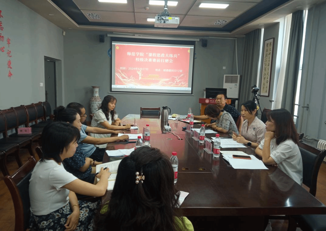 为进一步提高教师的课程思政教学能力,做好课程思政教学比赛工作,争取在学校课程思政“大练兵”教学活动中获得好成绩,6月27日上午,师范学院在明德楼B0312开展课程思政打磨活动。学院邀请“陕西省思想政治理论课大练兵教学标兵”贺文华教授,师范学院王华教授为进入学校课程思政决赛的两位老师进行点评打磨。学院党总支书记武军安、教学副院长李晶和各系部教研室主任参与此次活动并进行了点评、讨论。进入校级课程思政决赛的艾敏、...