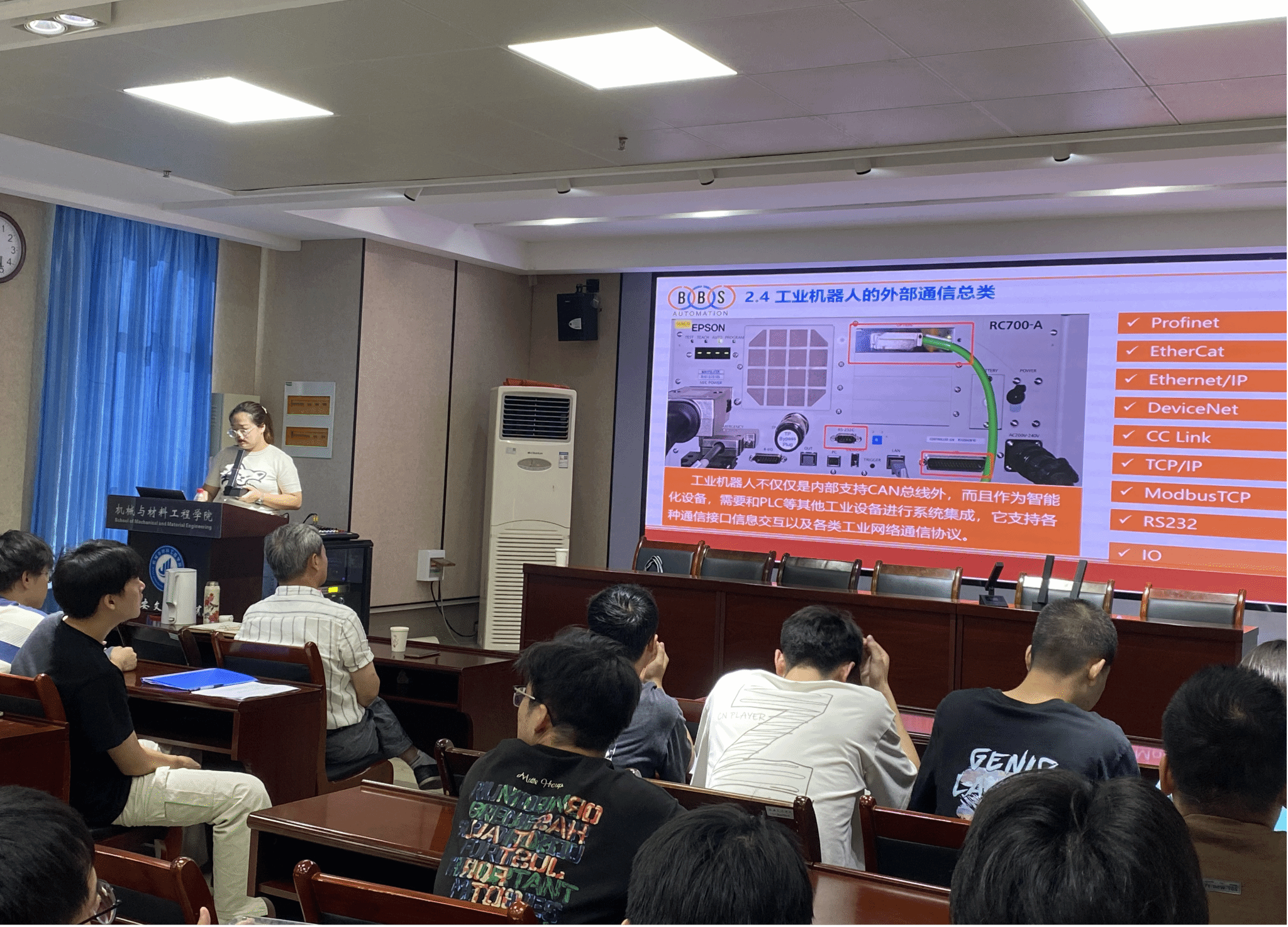 9月25日下午,机械与材料工程学院“校企合作BBS定制班”第二期第四讲如约开讲。本次活动邀请德国BBS公司机器人与相机应用专家黄佳宇主讲,BBS公司技术专家高级顾问雷明理、副院长杨森林、定制班管理负责老师全程指导。黄佳宇毕业于武汉轻工业大学电气工程及其自动化专业,从事非标自动化生产线研发七年,是BBS(苏州)公司机器人与相机应用专家。主要负责机器人相机工艺的调试,机器人模板的生成,相机技术方案的评估,以及机器人仿真流程优化。...